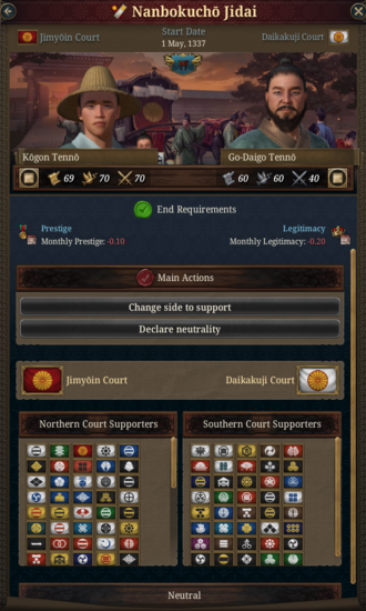 The countries that are involved in the Nanbokuchō Jidai situation are either neutral or divided into two sides: Jimyōin Court supporters and Daikakuji Court supporters. Members of the same side cannot declare war on each other. When the situation starts, every country involved will be given the choice to support the side they supported historically, support the other side, or remain neutral.